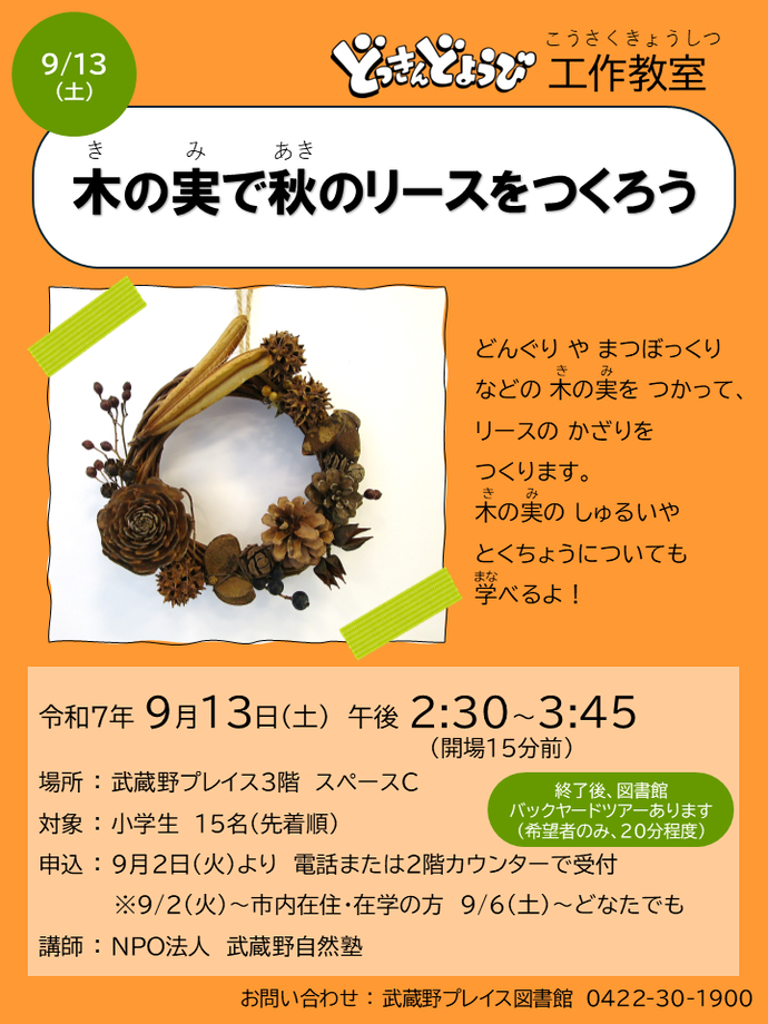 9月のどっきんどようびは武蔵野プレイスの工作教室。木の実を使って秋のリースを作ります。